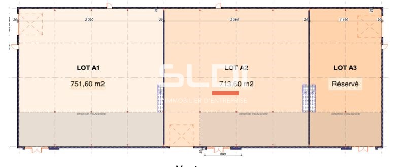 2 bâtiments divisibles en 5 cellules d'activités avec mezzanine , Livraison locaux bruts et fluides en attente , Toiture préconçue centrale photovoltaïque, Stationnement pré-équipé IRVE , Belle visibilité , Architecture soignée , Surface RDC : 1200 m², Surface terrain : 6277, Haut. libre max. ss poutre : 6 m, Ossature : Métallique, Murs périmétriques : Bardage double peau, Couverture : Bac acier isolé