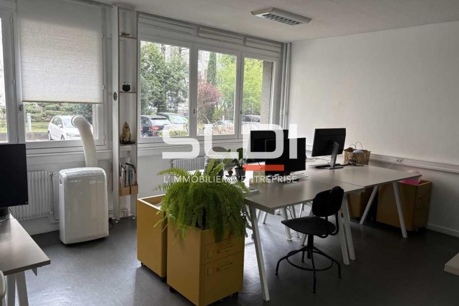 1 espace de coworking de 6 bureaux, 1 salle de réunion, 1 cuisine, 1 bureau 2 postes, Chauffage central, Volets roulants, Sanitaires, Accès non PMR car quelques marches., Une cave, Surface RDC : 84 m²